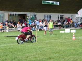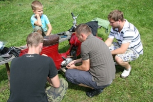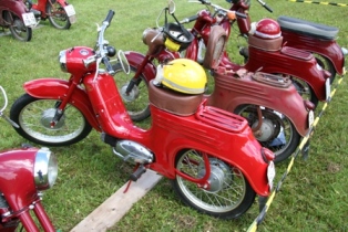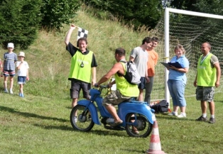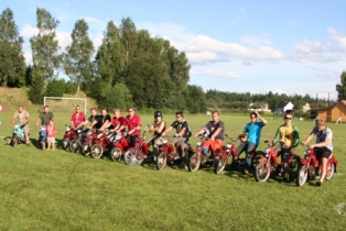 | Tento stroj se i přes veškerou snahu nedaří zprovoznit. Asi se mu nechtělo na rozdíl od majitele závodit. Odpoledne opět bez problémů vrčí. Záhada. | Start hlavního závodu na tři kola | Vyhlášení - hlavní závod 1. Jiří Stodolovský 2. Jan Hoffelner 3. Lukáš Lepša |