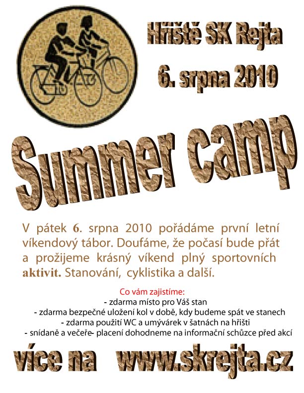 6.8.2010 pořádáme první letní víkendový tábor. Doufáme, že počasí bude přát a prožijeme krásný víkend plný sportovních aktivit. Tato akce je určena pro všechny bez rozdílu věku. Navržené trasy jsou vhodné pro rodiny s dětmi. Z důvodu zajištění bezpečnosti při přesunech po pozemních komunikacích MUSÍ mít děti dospělý doprovod a kola musí být v takovém technickém stavu, aby mohla být použita na pozemních komunikacích.